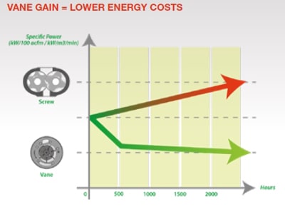 Indicatorii cheie, Energie Specifică și Eficiența Izentropică, reflectă nivelul de eficiență energetică livrat de un compresor de aer. Cu cât acești indicatori sunt mai eficienți în mașina pe care o achiziționați, cu atât veți plăti mai puțin furnizorului de servicii electrice pentru electricitatea necesară pentru a "porni" (bazată pe curentul de pornire) și pentru a "rula" compresorul ales. Energie Specifică se referă la cantitatea totală de energie (kW) care intră într-un compresor față de cantitatea de aer (m3/min) care iese. Cu cât numărul energiei specifice este mai mic, cu atât mașina este mai eficientă din punct de vedere energetic, reducând astfel factura de electricitate. Eficiența Izentropică este o calculație care neutralizează varianta de presiune în definirea cât de aproape de 100% eficiență mecanică este atinsă în fiecare compresor, unde un număr mai mare indică o eficiență energetică mai mare a compresorului, 100% fiind perfecțiunea.